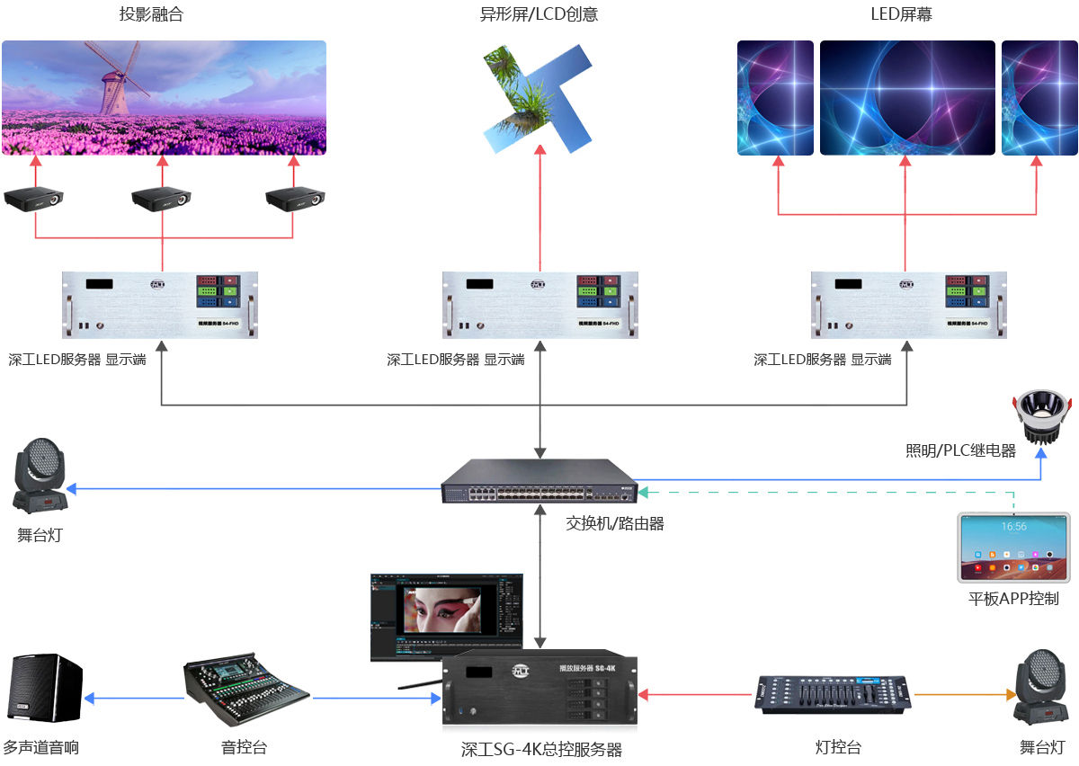 服務器支持多通道輸出或多臺服務器級聯,同時對視頻、燈光、音響及周邊設備按時間線進行同步控制。真正意義上的聲光電一體化總控解決方案。